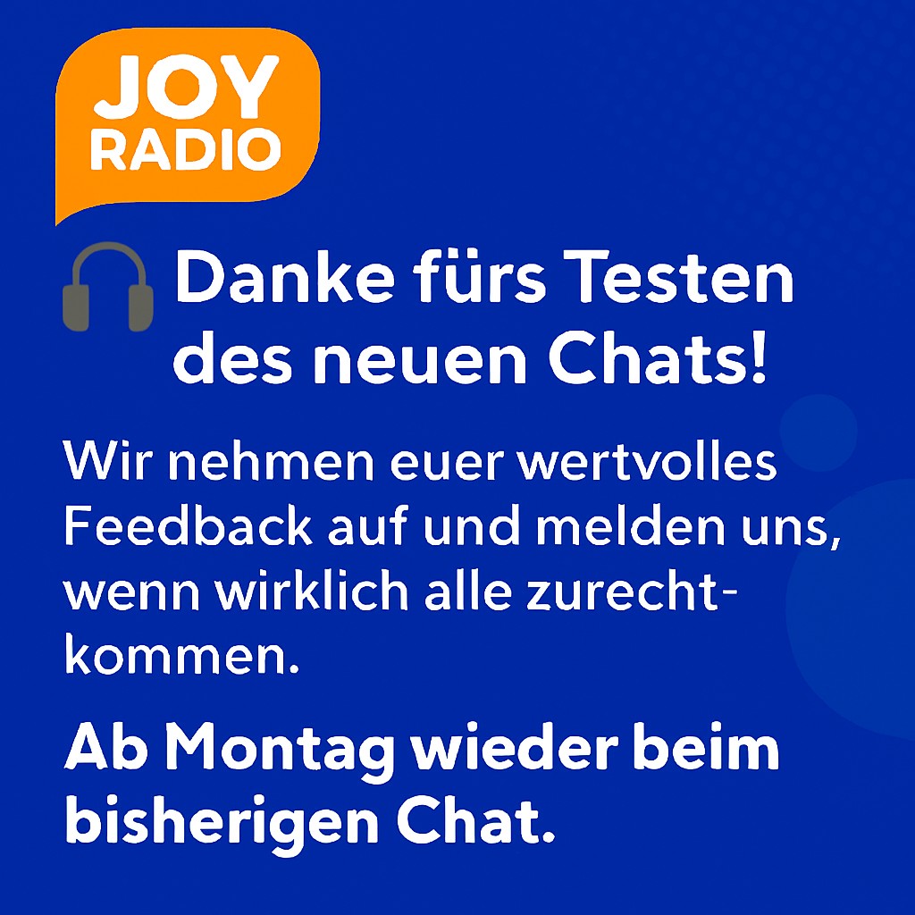 Liebe JOYRadio-Fans, ihr habt mit uns den neuen Chat ausprobiert – und dafür sagen wir herzlich Danke! 🙏 Wir haben viel positives Feedback bekommen, aber auch Hinweise, wo es noch hakt. Das nehmen wir ernst und arbeiten im Hintergrund weiter daran, bis wirklich alle damit zurechtkommen.